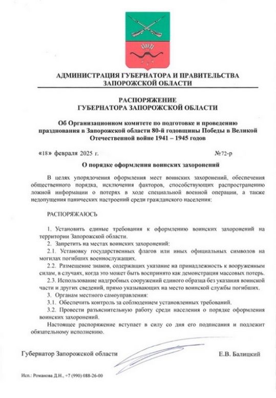 Глава региона Евгений Балицкий подписал распоряжение о порядке оформления мест воинских захоронений. Его цель — упорядочить захоронения, обеспечить общественный порядок и не допустить распространения недостоверной информации о потерях в ходе СВО.