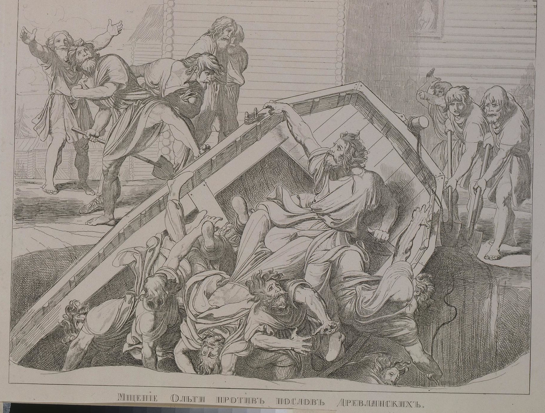 Первое древлянское посольство из 20 человек прибыло в ладье. Ольга притворно согласилась на брак и велела оказать послам высокую честь — нести их ладью на руках. Довольные древляне гордо восседали в лодке, не подозревая, что их несут к огромной яме. По приказу княгини послов вместе с ладьёй сбросили в яму и закопали живьём.