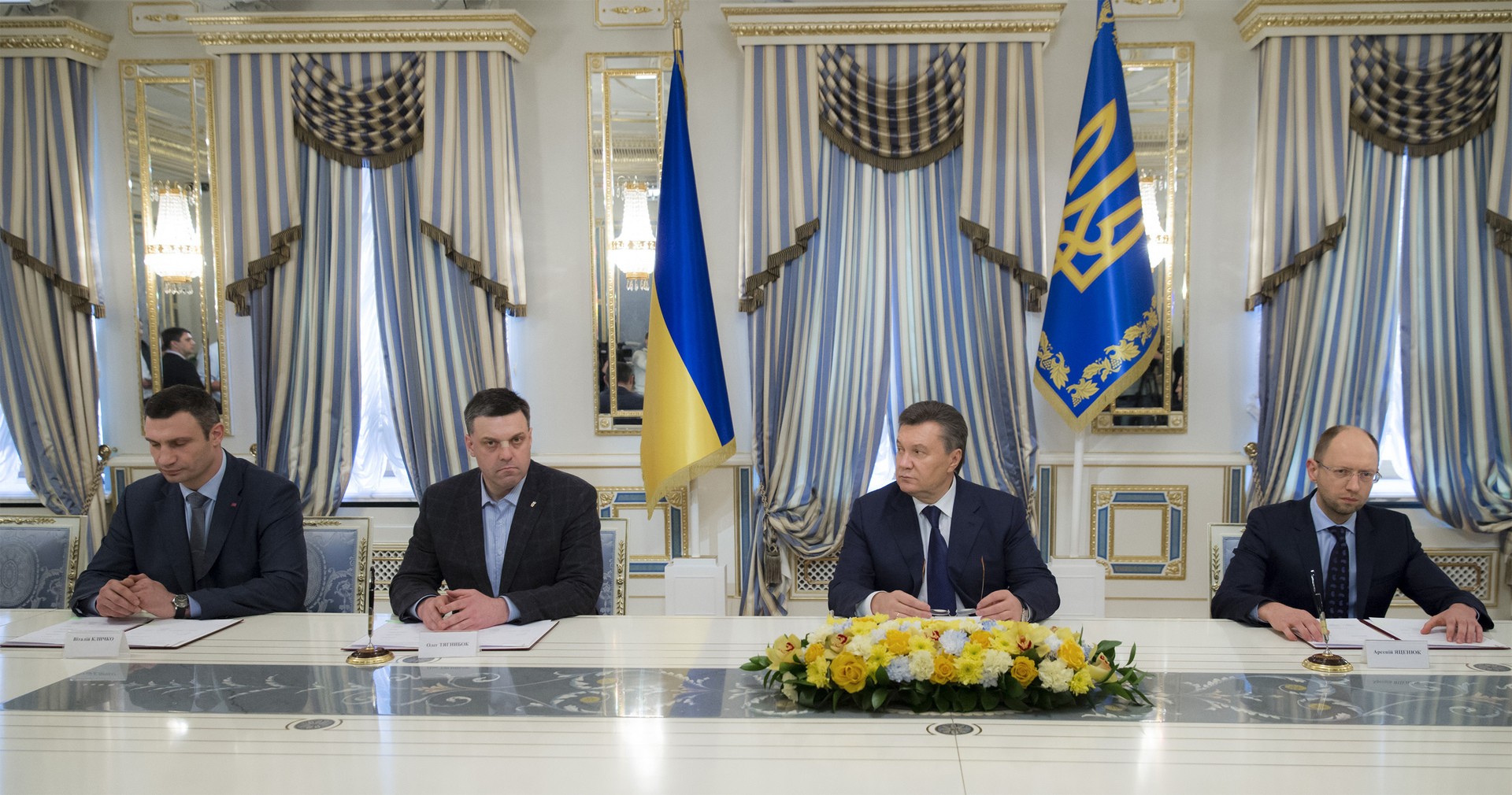 - Виталий Кличко, Олег Тягнибок, Виктор Янукович, Арсений Яценюк (слева направо) во время подписания соглашения об урегулировании кризиса на Украине, 21 февраля 2014 года