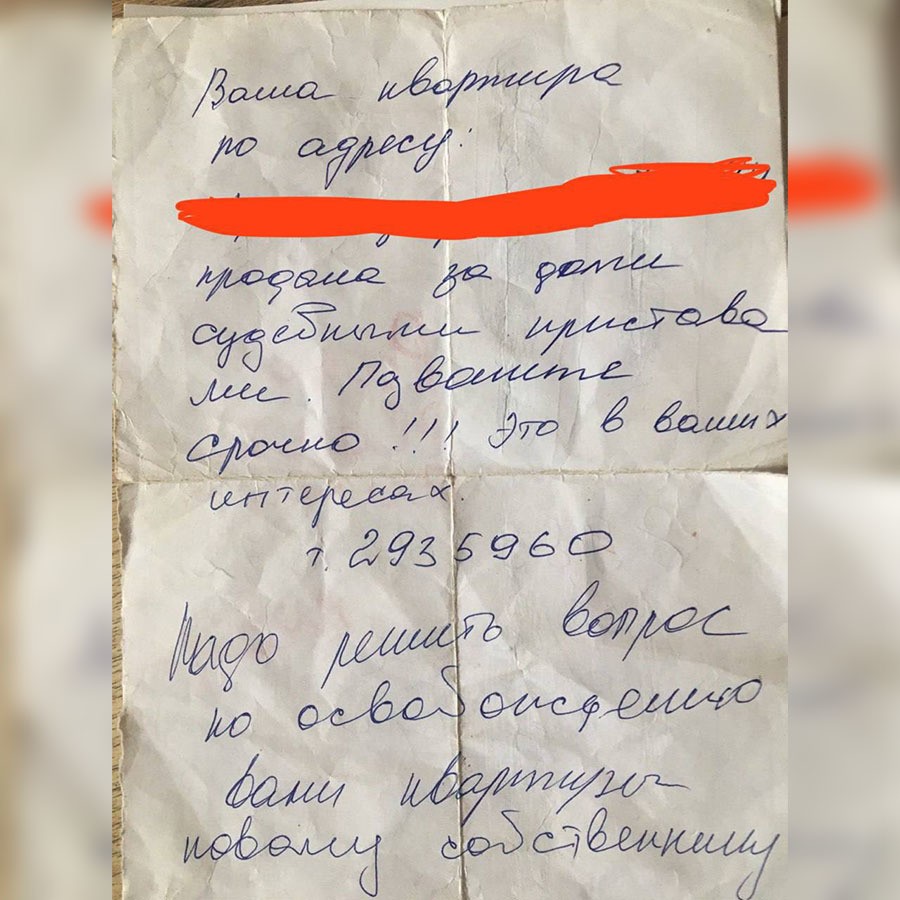 «В один прекрасный день нам в дверь суют записку, что надо освободить жилое помещение, потому что нашу квартиру купили другие люди. Для нас это шок, — вспоминает мужчина. — Жена толком телефоном не пользуется — у неё он кнопочный, и в целом она далека от всех технологий, приложений госуслуг и остального. Квартира эта — её родителей, матери 85, отцу 87. Они переписали жильё на дочь, так как боялись мошенников».