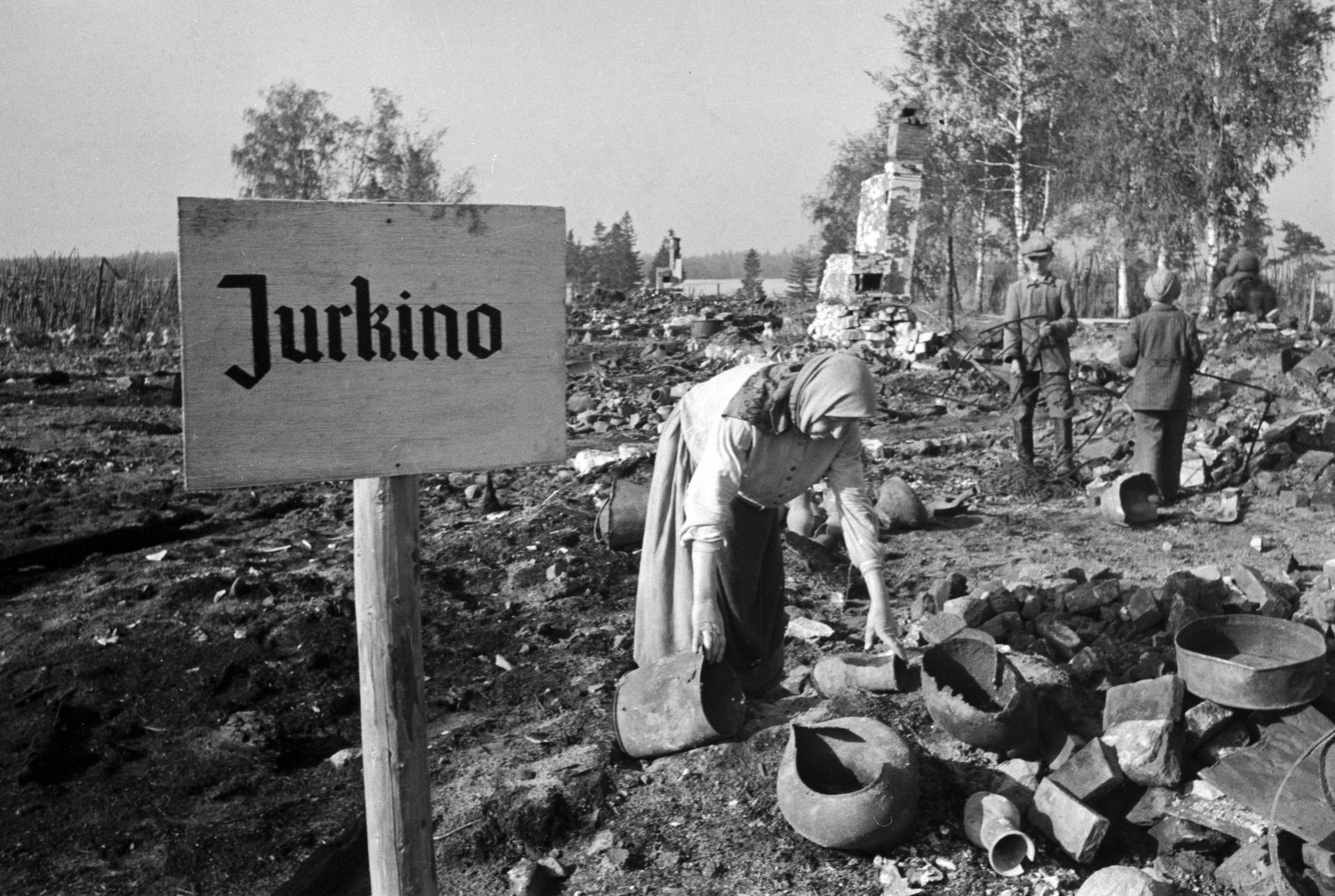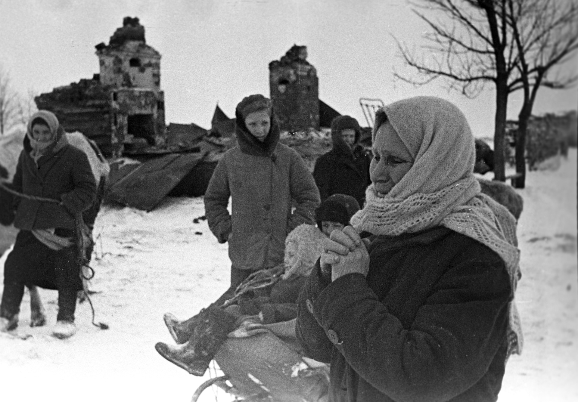 - Жители возвращаются в родное село Юркино Калининской области, освобождённое от немецкой оккупации. Женщина собирает уцелевшие остатки своего имущества на месте сгоревшей деревни