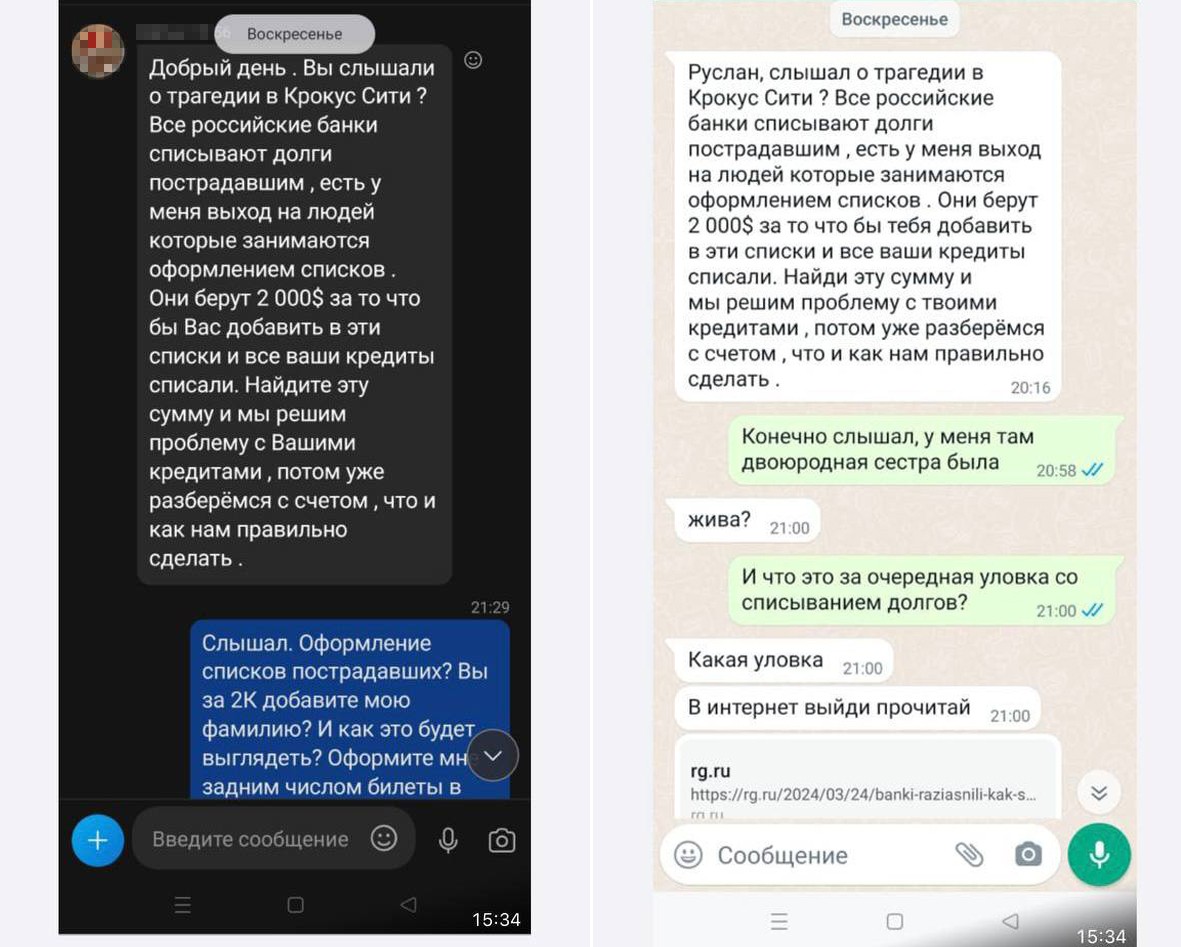 RT нашёл ещё одного человека, которому эти же мошенники предлагали включить его в списки пострадавших в «Крокусе» и таким образом списать кредиты. Он пожелал сохранить анонимность. В разговоре с ним злоумышленники назвали те же расценки, потребовав за «услугу» $2 тыс.