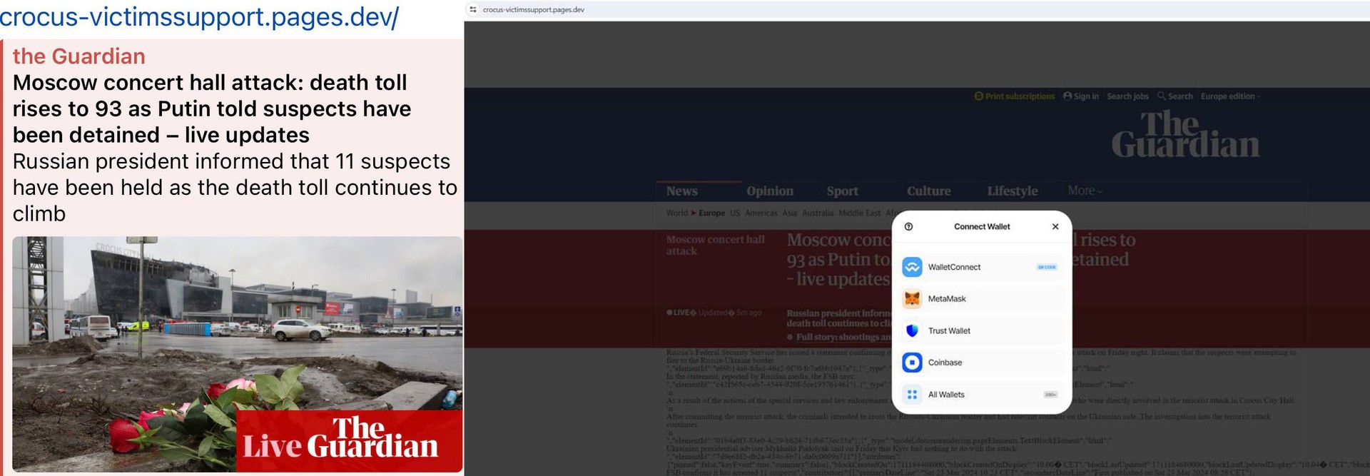 Специалисты службы информационной безопасности F.A.C.C.T. также рассказали RT о появлении в сети фишинговых сайтов, предлагающих отправлять пожертвования семьям погибших и пострадавшим в теракте в «Крокус Сити Холле». Один из таких ресурсов, в частности, маскируется под статью в британском издании The Guardian — в статье есть ссылка, якобы ведущая на сбор средств. При нажатии на неё пользователям предлагают привязать для оплаты свой криптокошелёк — после этого с него похищаются деньги.