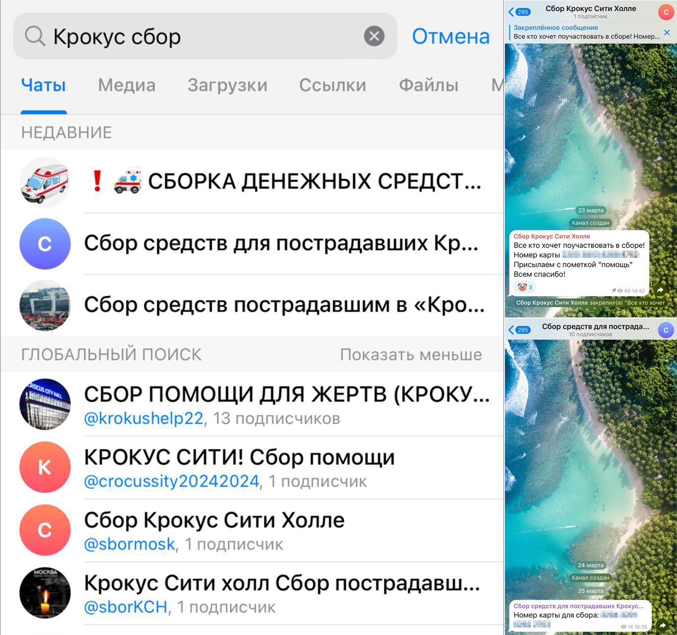 Как выяснил RT, «подставные» каналы для сбора помощи начали создаваться в популярных мессенджерах уже 24 марта. Называются они однотипно: «Сбор средств Крокус» и тому подобное. На таких страницах зачастую не указано никакой информации о сборщике средств, а при попытке перевода на указанный номер карты не идентифицируются ни её номер, ни Ф. И. О. владельца.