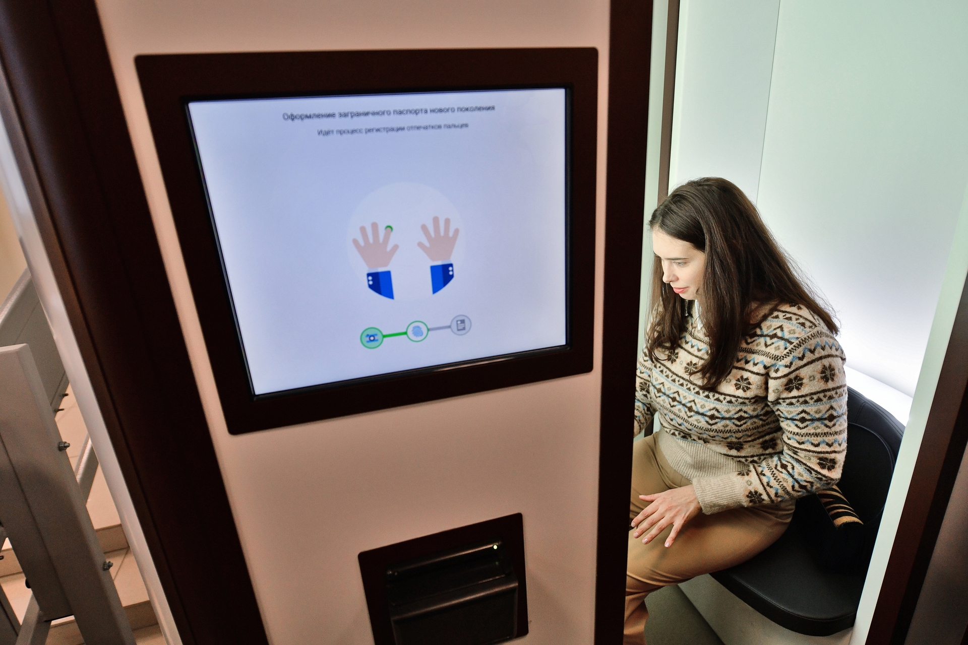 - Девушка сдаёт биометрические данные для оформления заграничного паспорта в специальной криптобиокабине в МФЦ в Екатеринбурге