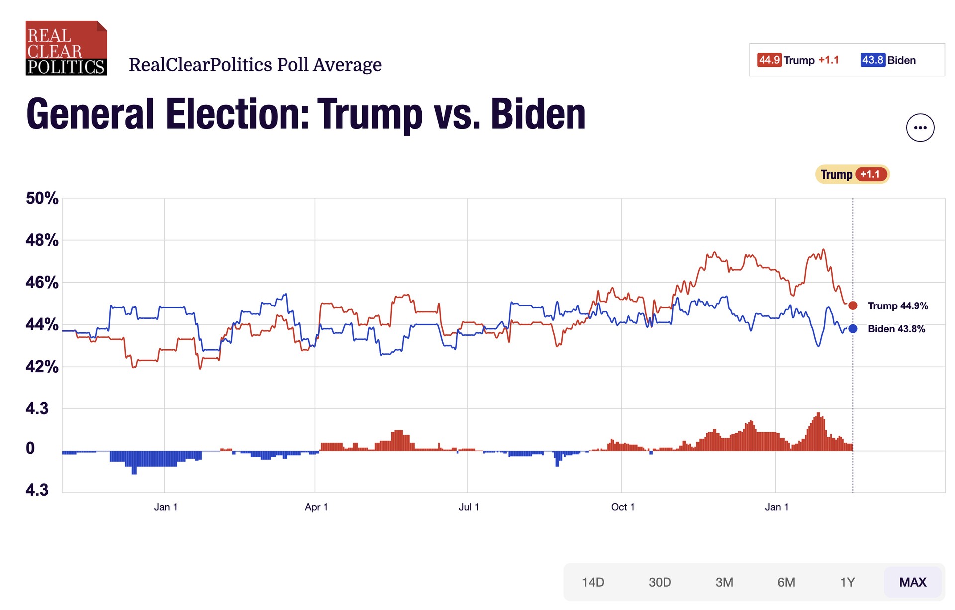 Согласно данным агрегатора социологических опросов RealClearPolitics, по состоянию на 16 февраля 2024 года Трампа готовы поддержать 44,9% опрошенных американцев, тогда как Байдена — 43,8%.
