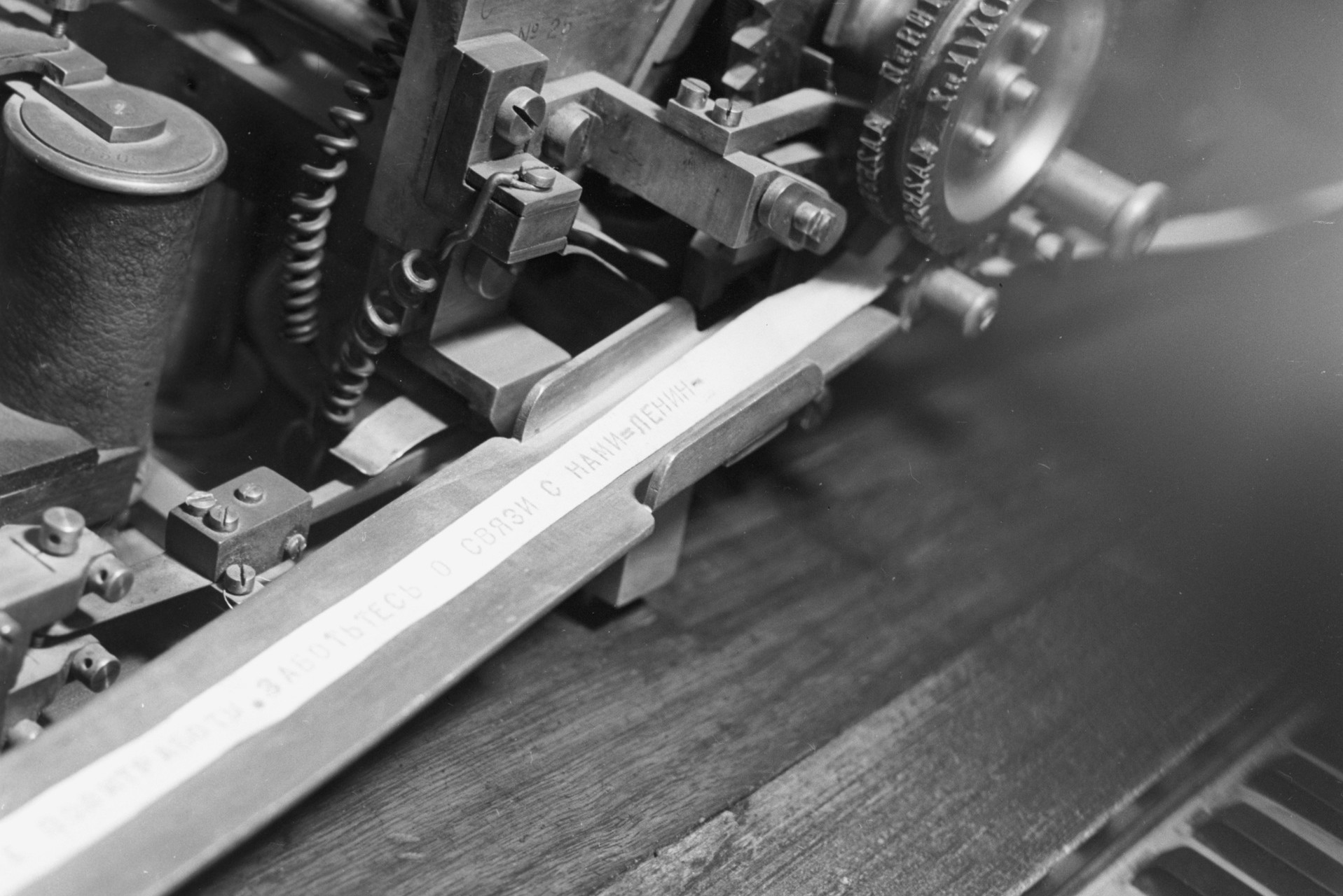• Телеграфный аппарат. На ленте — текст за подписью В.И. Ленина