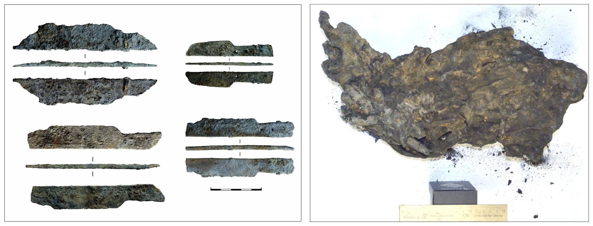 - Слева направо: фрагменты западноевропейских ножей из Архангельска, конгломерат оплавленных предметов