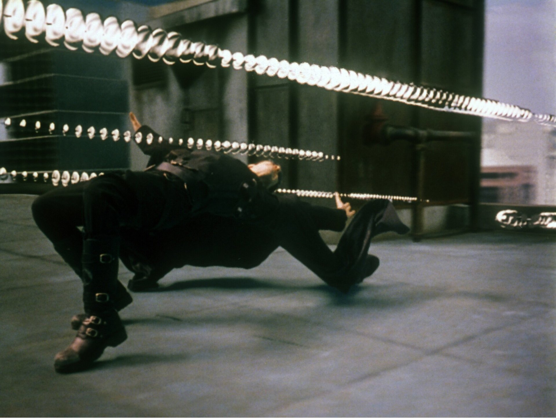 Среди наиболее запоминающихся моментов в картине — сцена на крыше, где Нео в замедленной съёмке уклоняется от летящей пули. По словам помощника режиссёров Джеймса МакТига, сначала он не имел ни малейшего представления о том, как это показать.