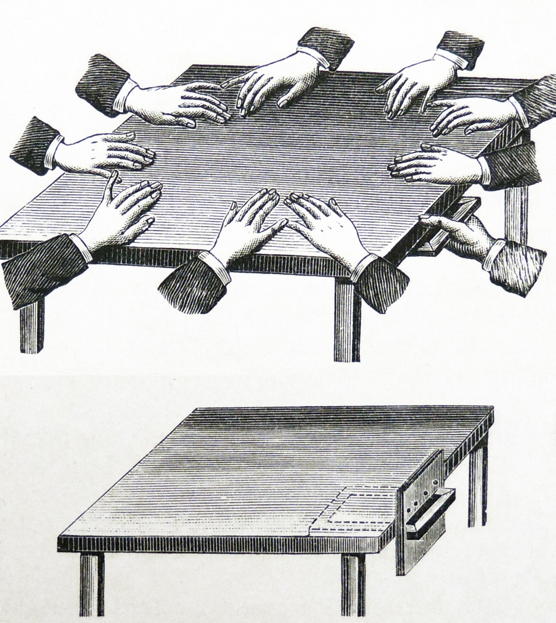 - Письмо от спиритуалистов: расположение рук на столе для создания надписей на грифельной доске во время спиритического сеанса. Внизу показан стол, приспособленный для письма через медиума. Гравюра, 1895 год