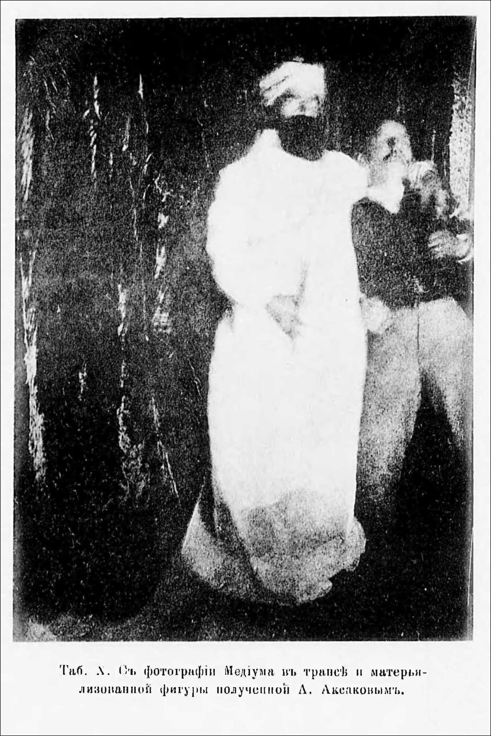 - Медиум в трансе и «материализованная» фигура. Фото А. Н. Аксакова