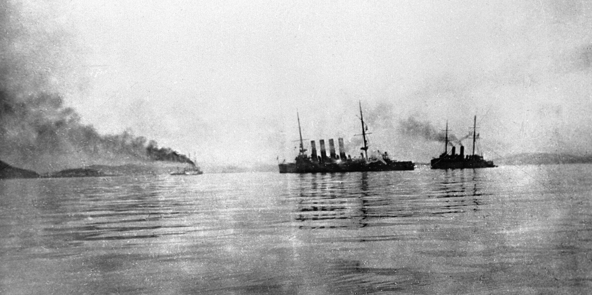 - Крейсер “Варяг” и канонерская лодка “Кореец” возвращаются после боя. Русско-японская война