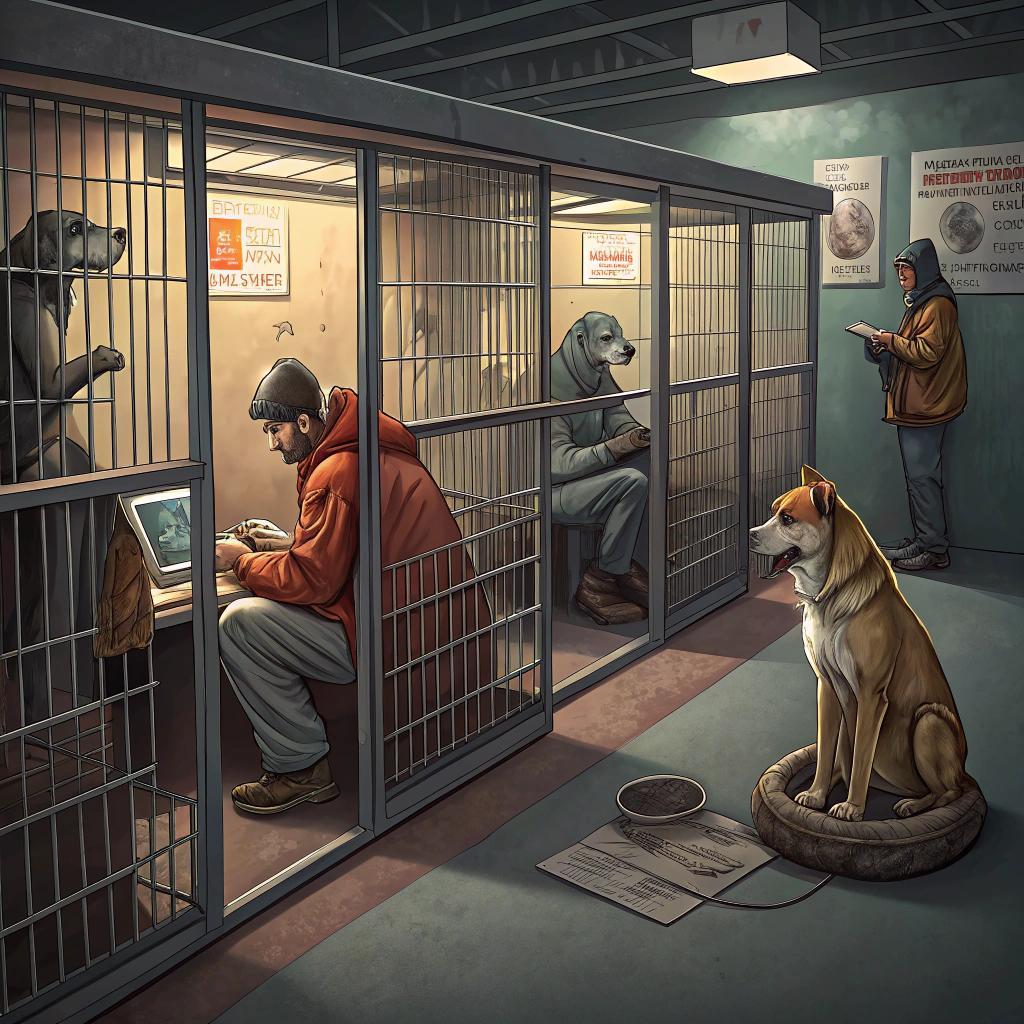 Такой шедевр, явно вдохновлённый фильмом «Планета обезьян», искусственный интеллект выдал по запросу «собачий приют». По мнению нейросети, не собаки приглядывают за людьми, а наоборот. Хотя со словом «приют» здесь можно поспорить: человек-пёс в одной из камер как бы намекает, что в этом месте вполне может располагаться экспериментальная лаборатория. Или кол-центр мошенников.