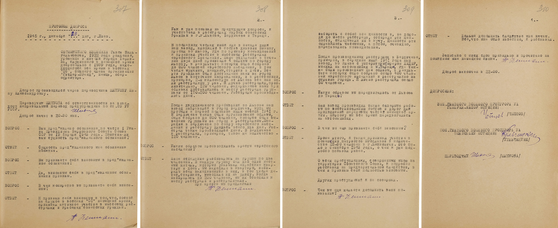«В последних числах июня или в начале июля (1941 года. — RT) наш взвод, входящий в состав дивизии «Викинг», прибыл во Львов, где по приказу командования я принимал участие в массовых расстрелах еврейского населения», — сознался на допросе Изенман.