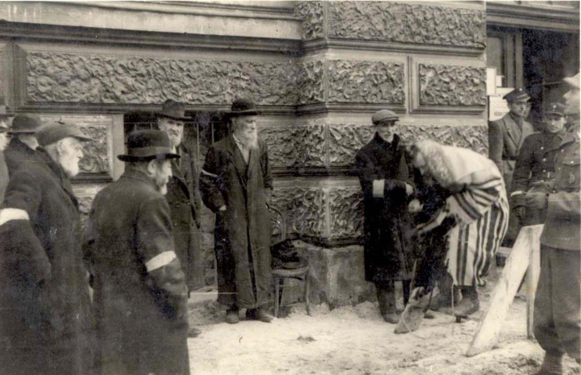 - Евреи молятся на улице в львовском гетто в присутствии офицеров СС